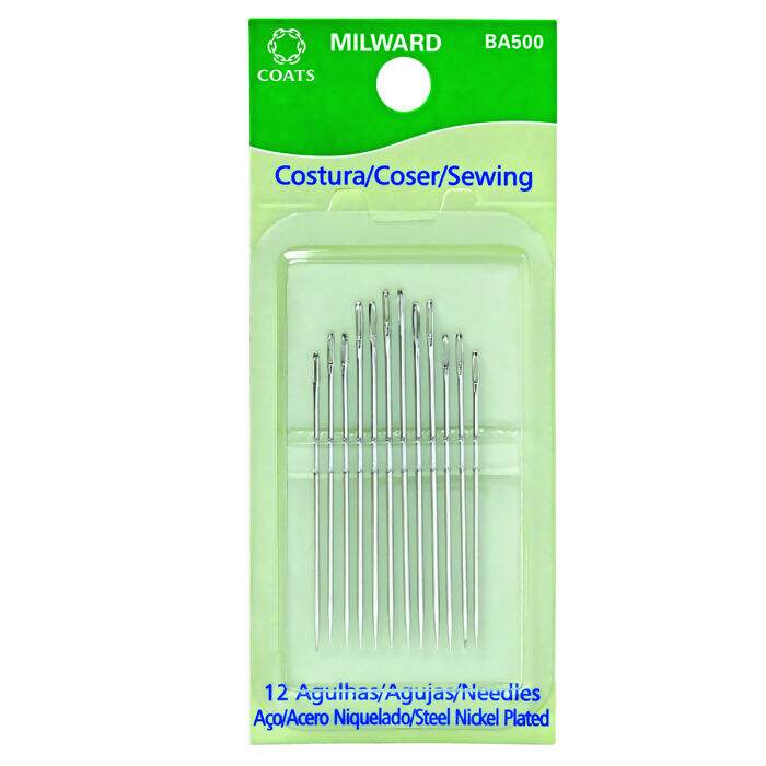 Agulha para costurar a mão indicada para bordar em tecidos e pregar botões. Disponível em um prático blister com 12 tamanhos de agulhas.