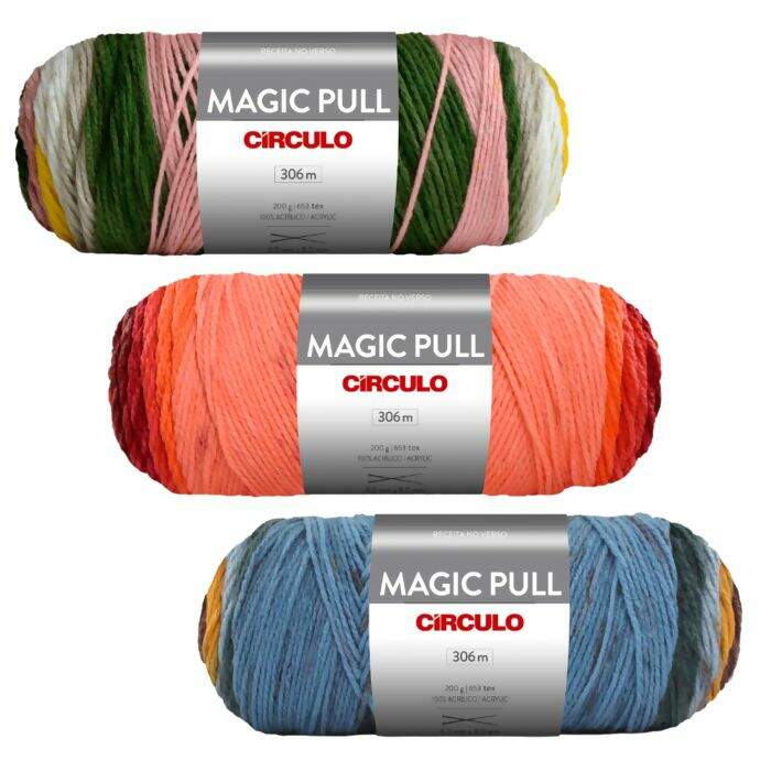 A família “Pull” (do inglês = puxar) é composta por novelos diferenciados, projetados para que o fio seja retirado do centro, facilitando a confecção das peças. A pontinha do fio está sinalizada com o selo do sistema “Easy Pull” - Puxe Fácil, patenteado pela Círculo. Cada novelo possui 200g.