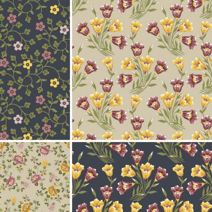 Coleção Lírios: 8 estampas florais delicadas nas cores marinho e creme.